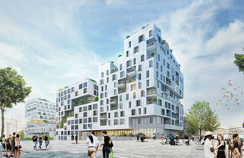 Chacun des trois immeubles à sa propre identité, tout en partageant les mêmes principes fondateurs : une silhouette ciselée et allégée, ménageant des ouvertures pour les vues, l’air et la lumière ; des rez-de-chaussée commerciaux transparents pour animer la vie de quartier ; un ruban vert comme fil conducteur : terrasses collectives et jardins partagés, terrasses et loggias privatives plantées, jardinières vertes, toitures végétalisées et plantées de grands arbres ; un jardin visible depuis le parvis Alan Turing et la place Tina Turner, au travers de deux belles percées visuelles.