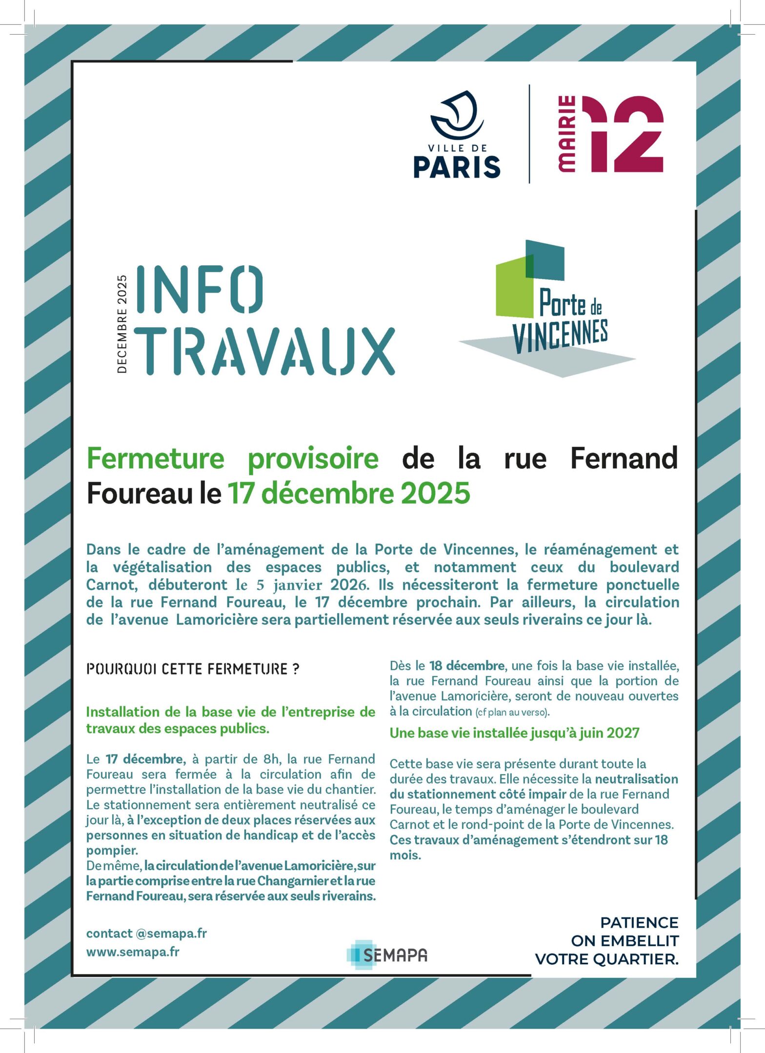 Dans le cadre de l’opération de la Porte de Vincennes, le réaménagement des espaces publics, et notamment ceux du boulevard Carnot, débuteront le 5 janvier 2026. Ils nécessiteront la fermeture ponctuelle de la rue Fernand Foureau, le 17 décembre prochain pour l’installation de la base vie de l’entreprise de travaux.