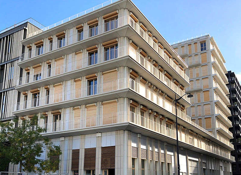 Cet ensemble de 89 logements familiaux, dessiné par Parc Architectes, accessible depuis trois porches d’entrée indépendants, deux rue Jacques Lacan, un rue Jeanne Chauvin, est construit sur la même parcelle que l’université de Chicago.